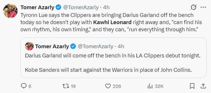 这场比赛之前泰伦卢表示,快船的新援加兰会从替补席出发,他不会一出场就与伦纳德搭档,泰伦卢希望加兰能够在第二阵容掌控节奏与时机,希望加兰通过组织进攻来帮助球队。