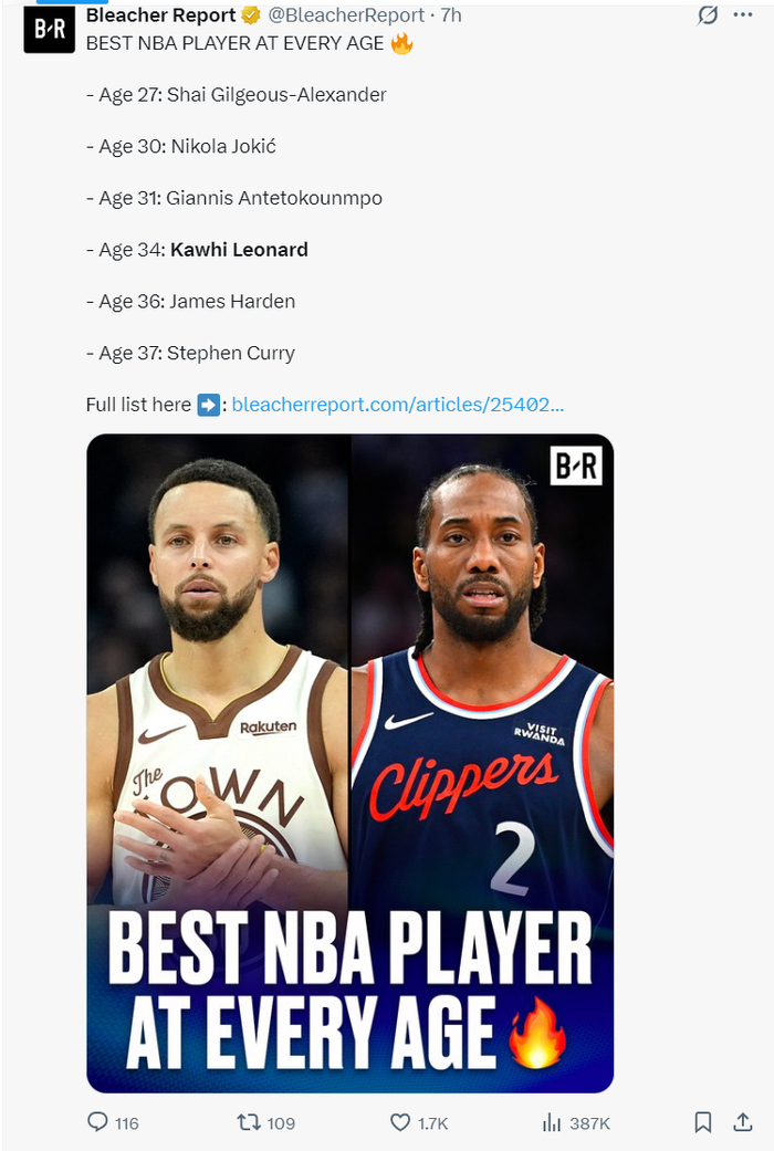 美媒BR也力挺现役最强34岁的球星是伦纳德,现役最强37岁的球星是库里而非杜兰特。
